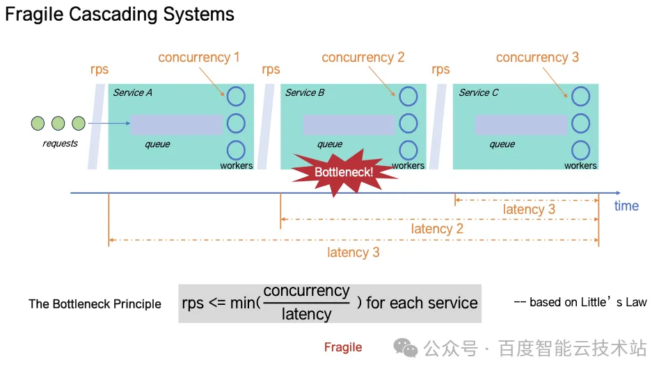 在此模型下,每个微服务的吞吐上限由「线程并发度」和「请求延迟」共同决定。一旦局部延迟上升、线程被占满,RPS 约束被打破,整个系统链路将进入「正反馈不稳定区」。