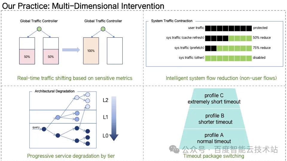 Multi-Dimensional Intervention(多层干预体系)当系统检测到关键指标(P99 延迟、失败率、线程利用率等)越界时,触发快速干预机制,包括跨 IDC 流量切换、系统内部流量裁剪、服务策略裁剪、动态砍超时重查。通过「秒级决策 + 自动执行」实现系统自愈。