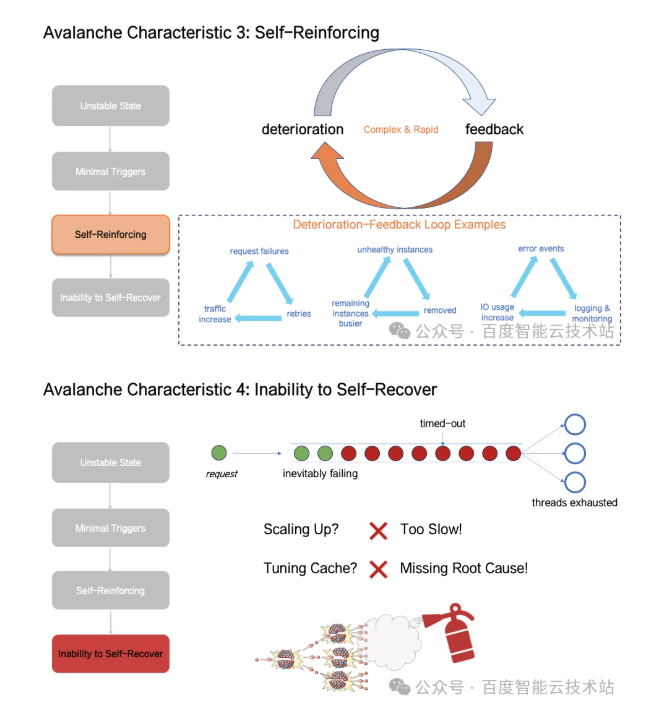 彻底雪崩:此阶段系统做无效计算,有效吞吐大幅下降,系统无法依靠自身恢复,必须通过外力打破正反馈通路才能恢复系统;