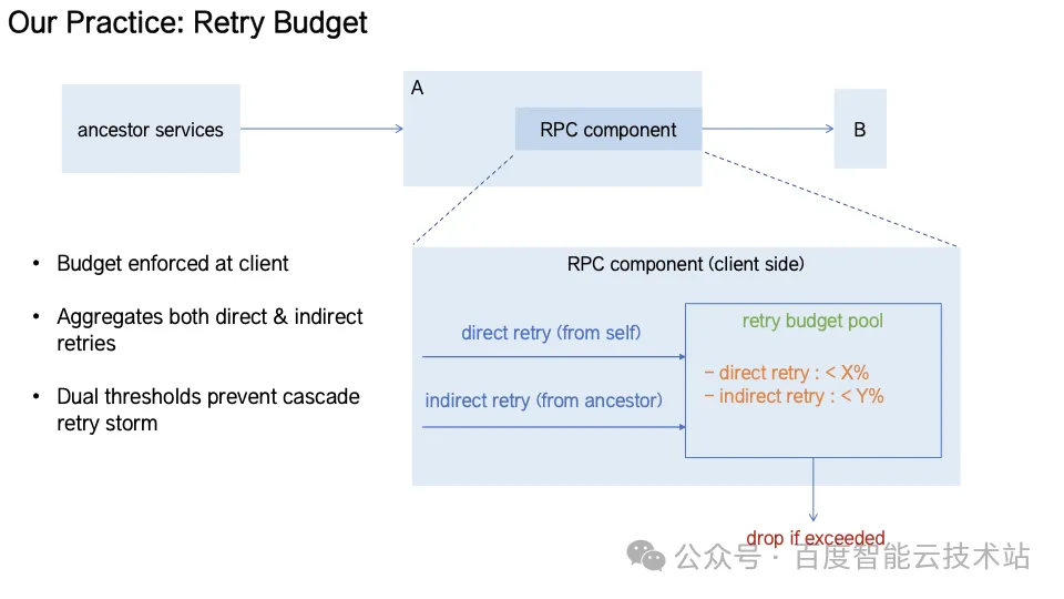 Retry Budget(重试预算)通过在 RPC 组件层实现全链路重试预算池,区分「直接重试」和「间接重试」,并为不同来源设定预算阈值。当预算耗尽时自动快速失败,从机制层面抑制重查风暴,系统重试流量从指数增长退化为线性增长。