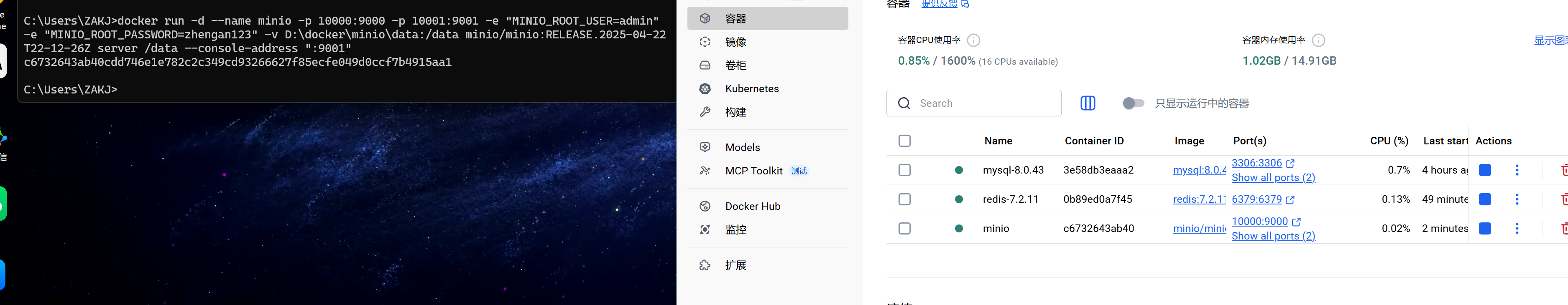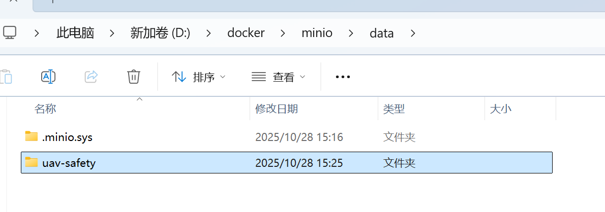 docker run -d --name minio -p 10000:9000 -p 10001:9001 -e "MINIO_ROOT_USER=admin" -e "MINIO_ROOT_PASSWORD=zhengan123" -v D:\docker\minio\data:/data minio/minio:RELEASE.2025-04-22T22-12-26Z server /data --console-address ":9001"