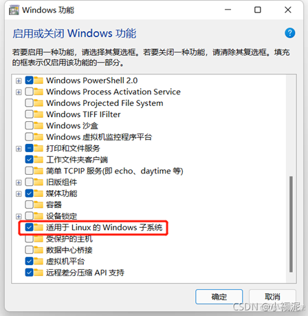 在windows设置中打开【启用或关闭Windwos功能】,勾选【适用于Linux的Windwos子系统】,点击确定后会系统会提示重启,选择确认即可