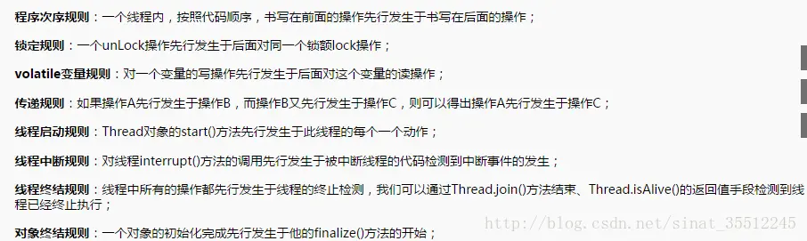 如果一个操作执行的结果需要对另一个操作可见,那么这两个操作之间必须要存在happens-before关系。