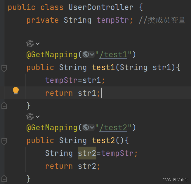如上图示例代码,如果访问/test1请求的时候传入的值是“王二”,那么类成员变量tempStr的值就是“王二”。当随后访问/test2请求时我们想要得到的返回值也希望是“王二”,但如果在这之前有人又访问了/test1请求,会发生什么?