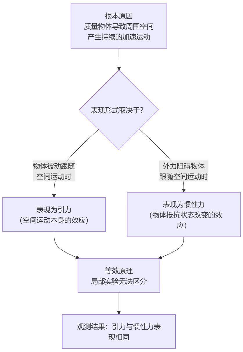 flowchart TDA[根本原因<br>质量物体导致周围空间<br>产生持续的加速运动] --> B{表现形式取决于?}B -- 物体被动跟随<br>空间运动时 --> C[表现为引力<br>(空间运动本身的效应)]B -- 外力阻碍物体<br>跟随空间运动时 --> D[表现为惯性力<br>(物体抵抗状态改变的效应)]C & D --> E[等效原理<br>局部实验无法区分]E --> F[观测结果:引力与惯性力表现相同]
