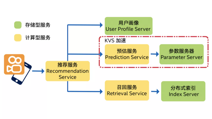 为应对海量数据冲击,快手的推荐系统采用计算与存储分离的架构模式。参数服务器属于存储型服务,该服务要保存和实时更新上亿规模的用户画像、数十亿规模的短视频特征、以及千亿规模的排序模型参数。并且,它不仅受限于容量和带宽,而且还要支撑每秒数亿次的 KV 请求,这会消耗大量 CPU 资源,成为其性能的主要瓶颈。通过使用英特尔至强可扩展处理器、英特尔Agilex™FPGA和英特尔傲腾™持久内存,借助软硬一体化、领域专用加速器设计,使快手的LaoFe NDP近数据架构在计算体系结构上实现创新,从而做到网络、存储、计算三重加速,为各个业务系统提供低延迟、高并发、高吞吐、低总体拥有成本的基础资源。
