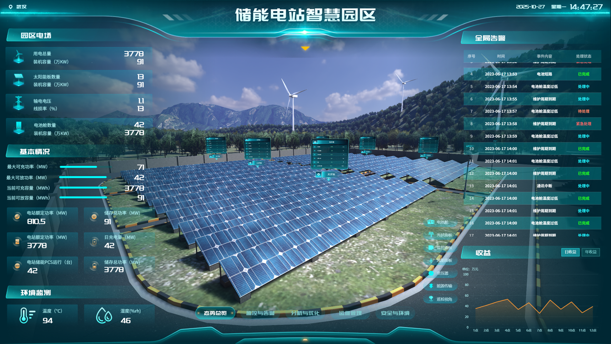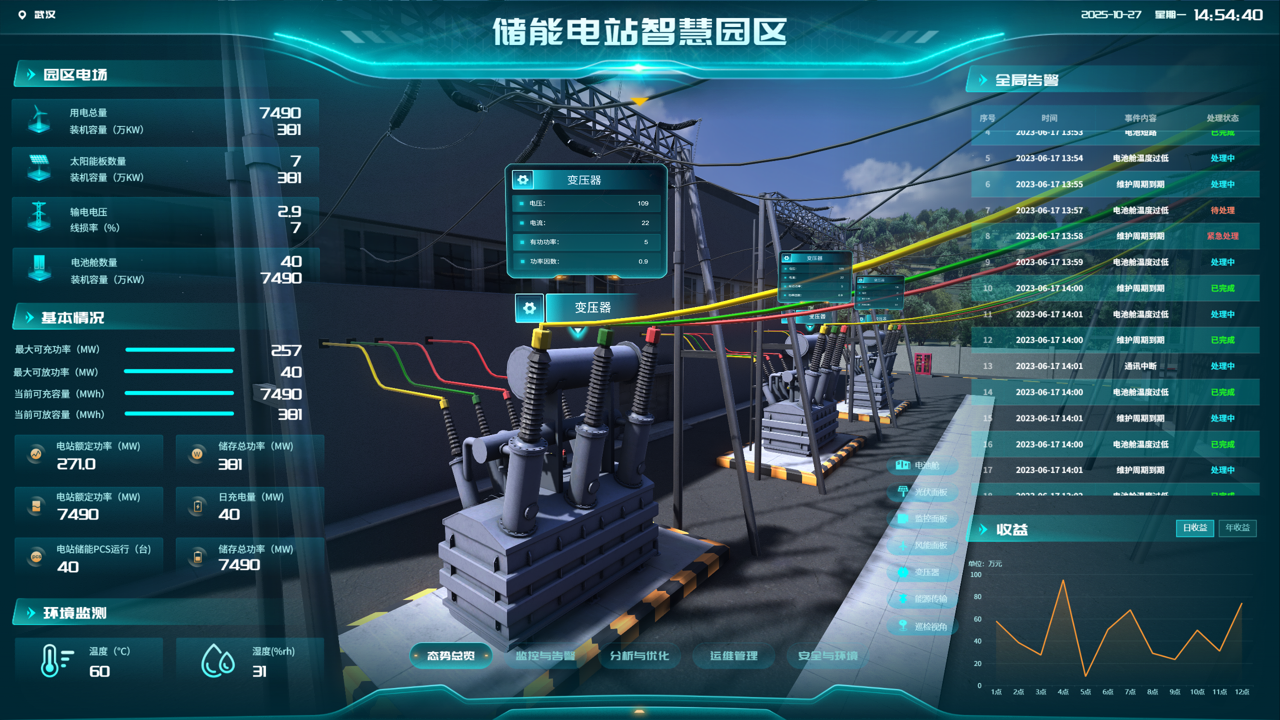 实时监测多类核心设备运行参数,专项监测储能电池组、变压器,光伏板阵列,自动触发分级预警,实现 “异常早发现、风险早处置”。支持一键切换功能模块,通过多维度数据穿透,从宏观园区态势深入至单台设备的实时运行状态,实现储能电站运营的精细化、智能化管控。