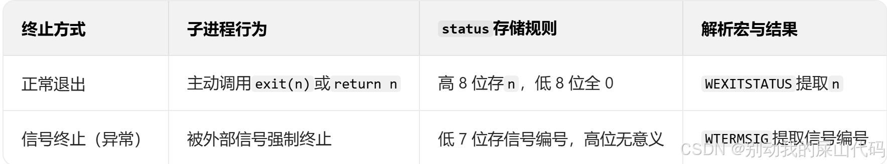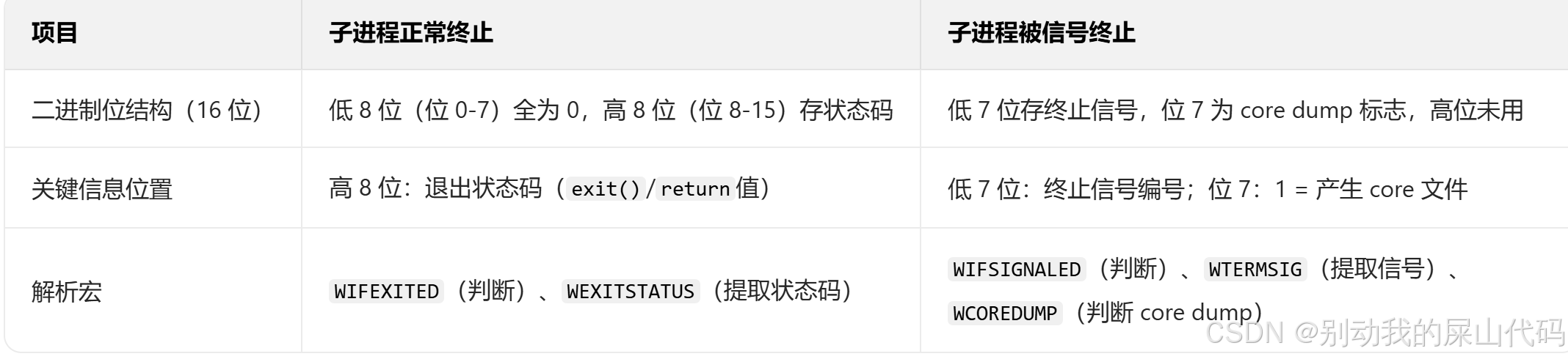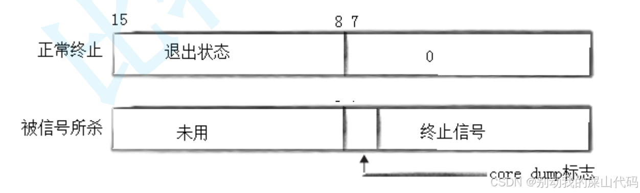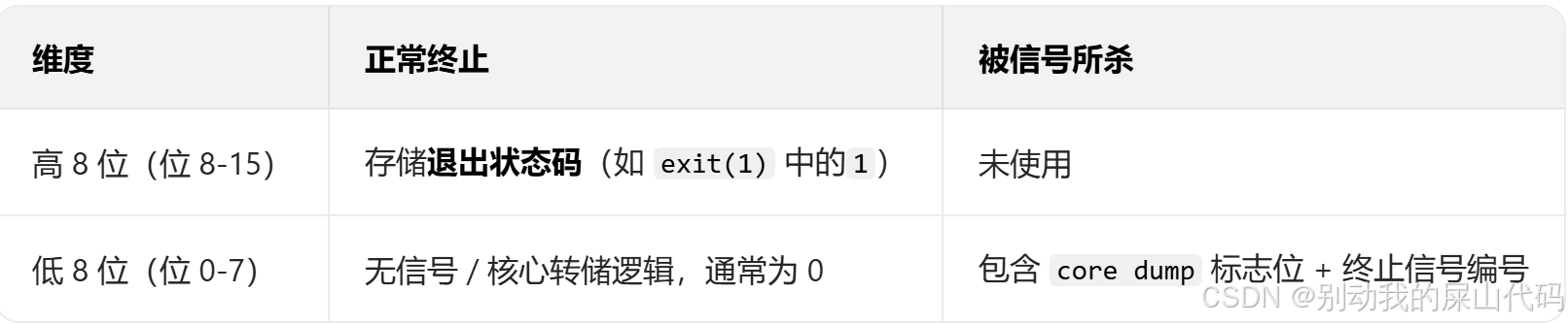 此时 ** 高 8 位(位 8-15)** 存储 “退出状态码”,** 低 8 位(位 0-7)** 为 0(或对应正常退出的结构)。