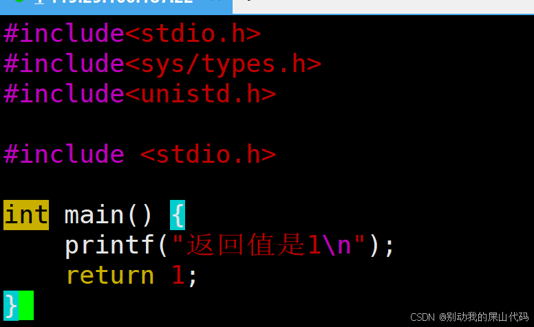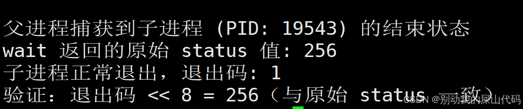 #include <sys/wait.h>int main() {pid_t pid = fork();if (pid == -1) {perror("fork 失败");exit(EXIT_FAILURE);}if (pid == 0) {printf("子进程 (PID: %d) 即将以退出码 1 结束\n", getpid());exit(1);} else {int status;pid_t waited_pid = wait(&status);if (waited_pid == -1) {perror("wait 失败");exit(EXIT_FAILURE);}printf("\n父进程捕获到子进程 (PID: %d) 的结束状态\n", waited_pid);printf("wait 返回的原始 status 值: %d\n", status);if (WIFEXITED(status)) {int exit_code = WEXITSTATUS(status);printf("子进程正常退出,退出码: %d\n", exit_code);printf("验证:退出码 << 8 = %d(与原始 status 一致)\n", exit_code << 8);} else {printf("子进程未正常退出(可能被信号终止)\n");}}return 0;
