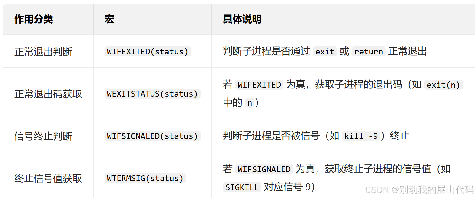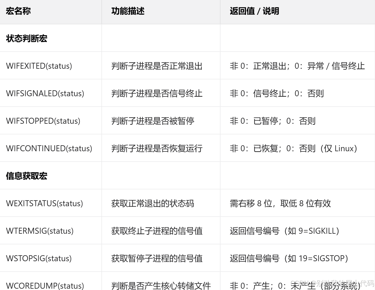 当 status 不为 NULL 时,它存储的是子进程的 “原始退出状态”(一个整数,需通过系统提供的宏解析)。常用宏如下: