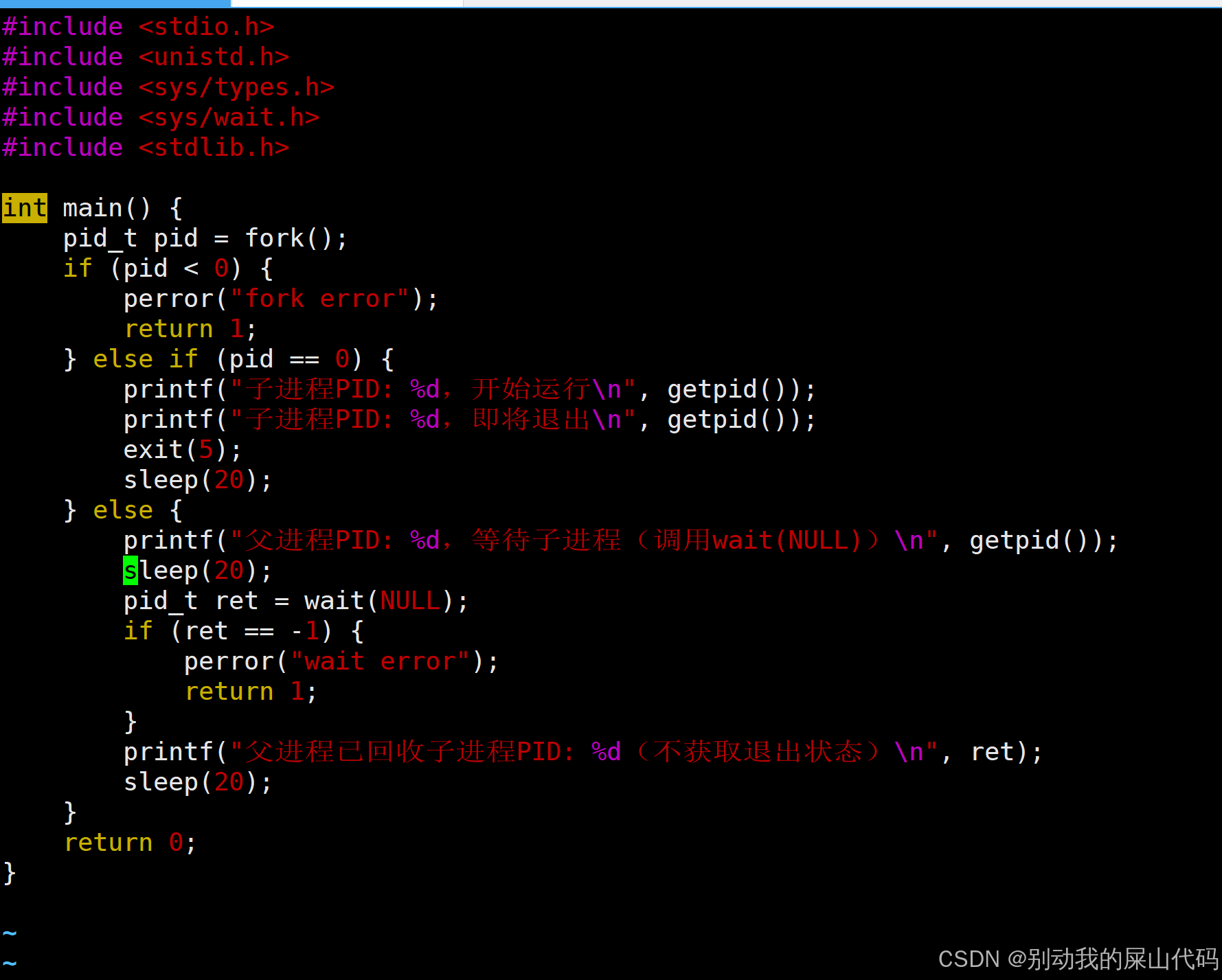 pid_t wait(int *status);头文件:需要包含 <sys/wait.h> 和 <sys/types.h>