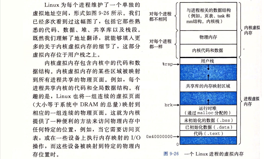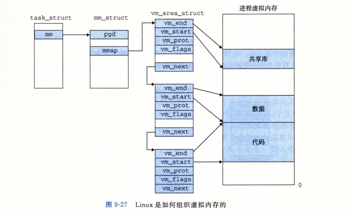 图 9-27 强调了记录一个进程中虚拟内存区域的数据结构。内核为系统中的每个进程维护一个单独的任务结构(源代码中的 task_struct)。任务结构中的元素包含或者指向内核运行该进程所需要的所有信息(例如,PID、指向用户栈的指针、可执行目标文件的名字,以及程序计数器)。