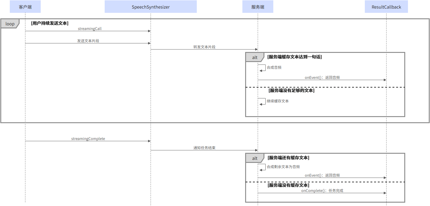 streamingCall方法分片提交待合成文本,将待合成文本分段发送至服务端。在发送文本的过程中,服务端会通过回调接口(ResultCallback)的