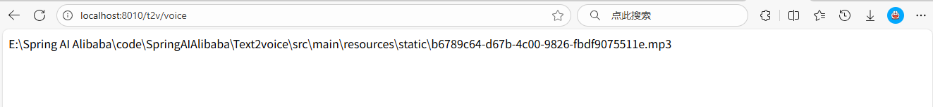 public class Text2VoiceController {@Resourceprivate SpeechSynthesisModel speechSynthesisModel;//voice modelpublic static final String BAILLIAN_VOICE_MODEL = "cosyvoice-v2";//voice timberpublic static final String BAILLIAN_VOICE_TIMBER = "longyingcui";//龙应催@GetMapping("/t2v/voice")public String voice(@RequestParam(name = "msg",defaultValue = "温馨提示,支付宝到账100元请查收")String msg){// 此处地址需要更改为自己存放音频文件的地址String filePath = "E:\\Spring AI Alibaba\\code\\SpringAIAlibaba\\Text2voice\\src\\main\\resources\\static\\"+ UUID.randomUUID() + ".mp3";//1.语音参数设置DashScopeSpeechSynthesisOptions options = DashScopeSpeechSynthesisOptions.builder().model(BAILLIAN_VOICE_MODEL).voice(BAILLIAN_VOICE_TIMBER).build();//2.调用大模型语音生成对象SpeechSynthesisResponse response = speechSynthesisModel.call(new SpeechSynthesisPrompt(msg,options));//3.字节流语音转换ByteBuffer byteBuffer = response.getResult().getOutput().getAudio();//4.文件生成,保存到本地try(FileOutputStream fileOutputStream = new FileOutputStream(filePath)) {fileOutputStream.write(byteBuffer.array());} catch (FileNotFoundException e) {throw new RuntimeException(e);} catch (IOException e) {throw new RuntimeException(e);}return filePath;}