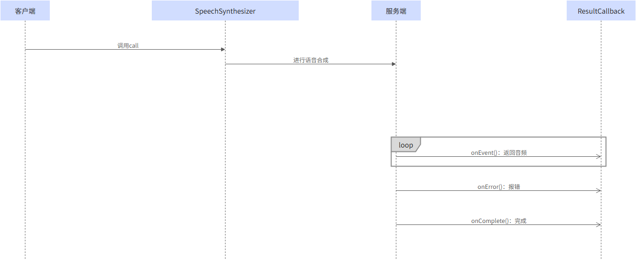 实例化SpeechSynthesizer类绑定请求参数和回调接口(ResultCallback),调用call方法进行合成并通过回调接口(ResultCallback)的onEvent方法实时获取合成结果。