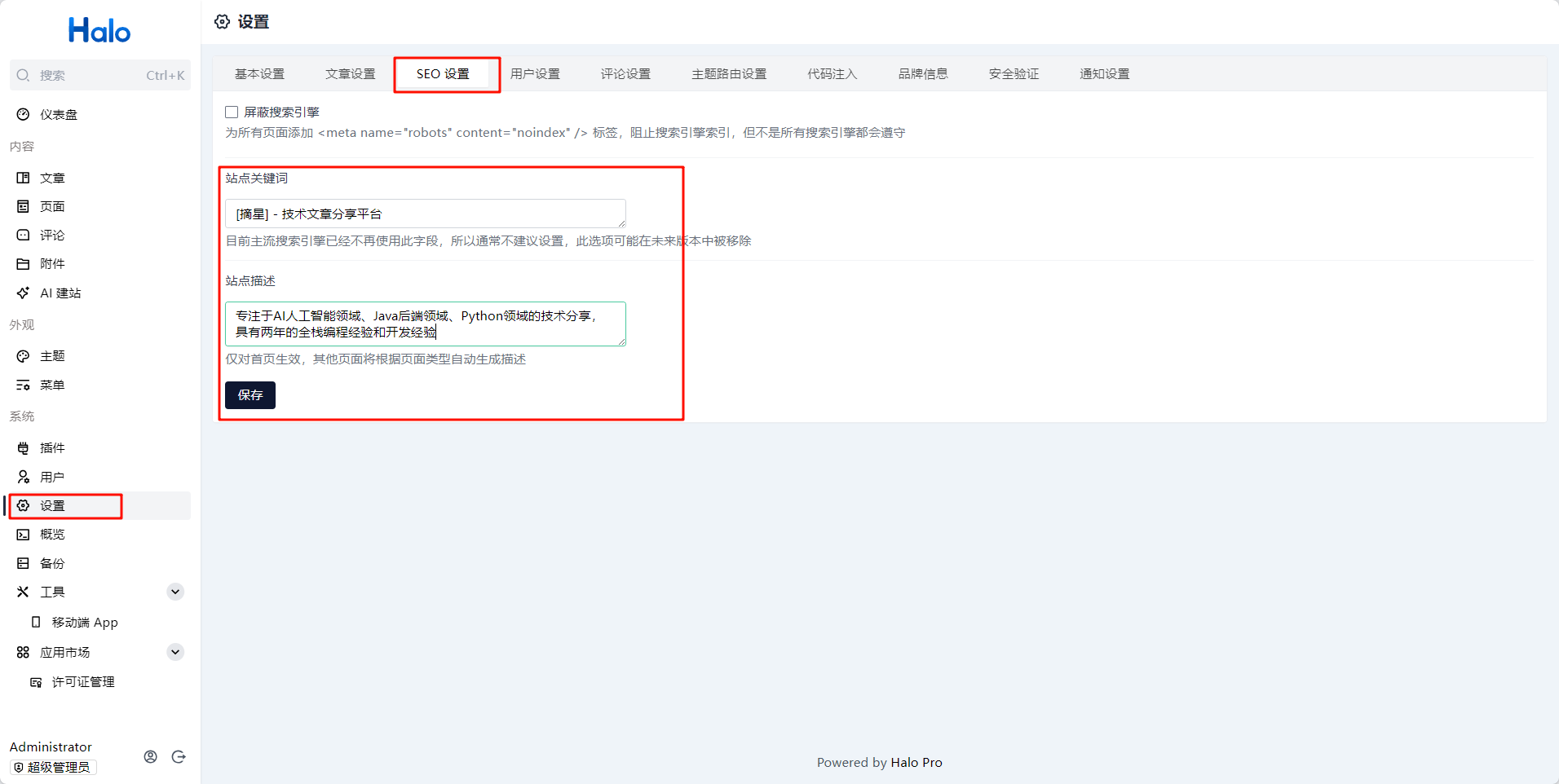为了让博客真正被搜索引擎发现,我不仅配置了精准的站点标题、描述和关键词(如“云原生”“开发经验”“技术分享”),还安装了 Halo 的 SEO 插件以增强元数据控制。此外,我还探索了几个高阶集成: