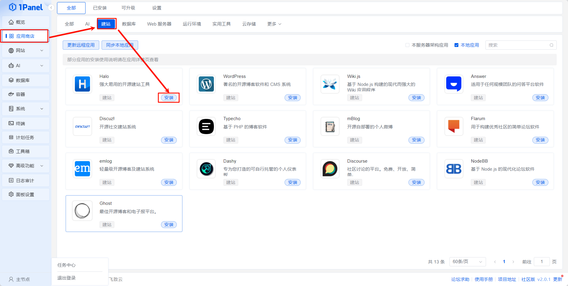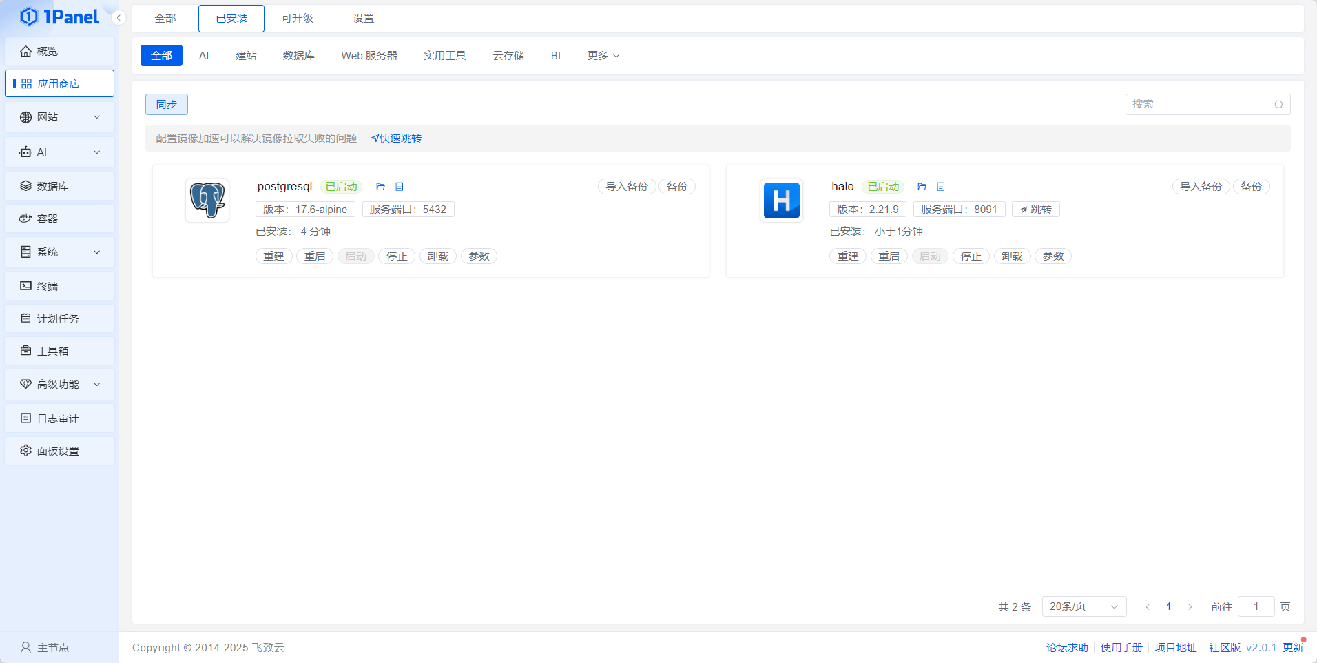 | 应用商店 | 一键安装主流应用(如 Halo、WordPress、MySQL、Redis 等),支持版本管理、启停、配置修改与卸载 |