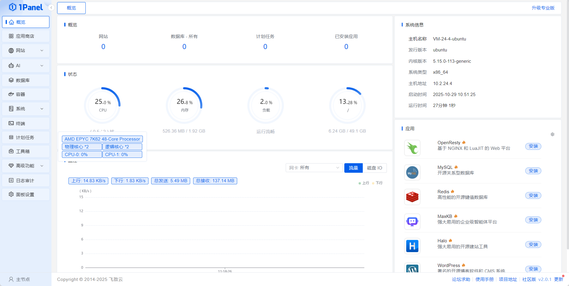 | 应用商店 | - 一键安装 Halo、WordPress、MySQL、Redis、Nginx、OpenResty、MaxKB、宝塔兼容版等 |