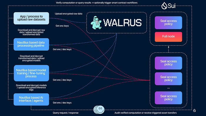 可验证 AI 工作流的高层视图:数据存储在 Walrus 上,在 Nautilus 可信环境中进行处理,并通过 Seal 的访问控制策略在 Sui 上进行协调。