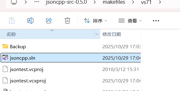 需要进入 makefiles——>vs71——>jsoncpp.sln 使用VS打开jsoncpp.sln;如下图所示: