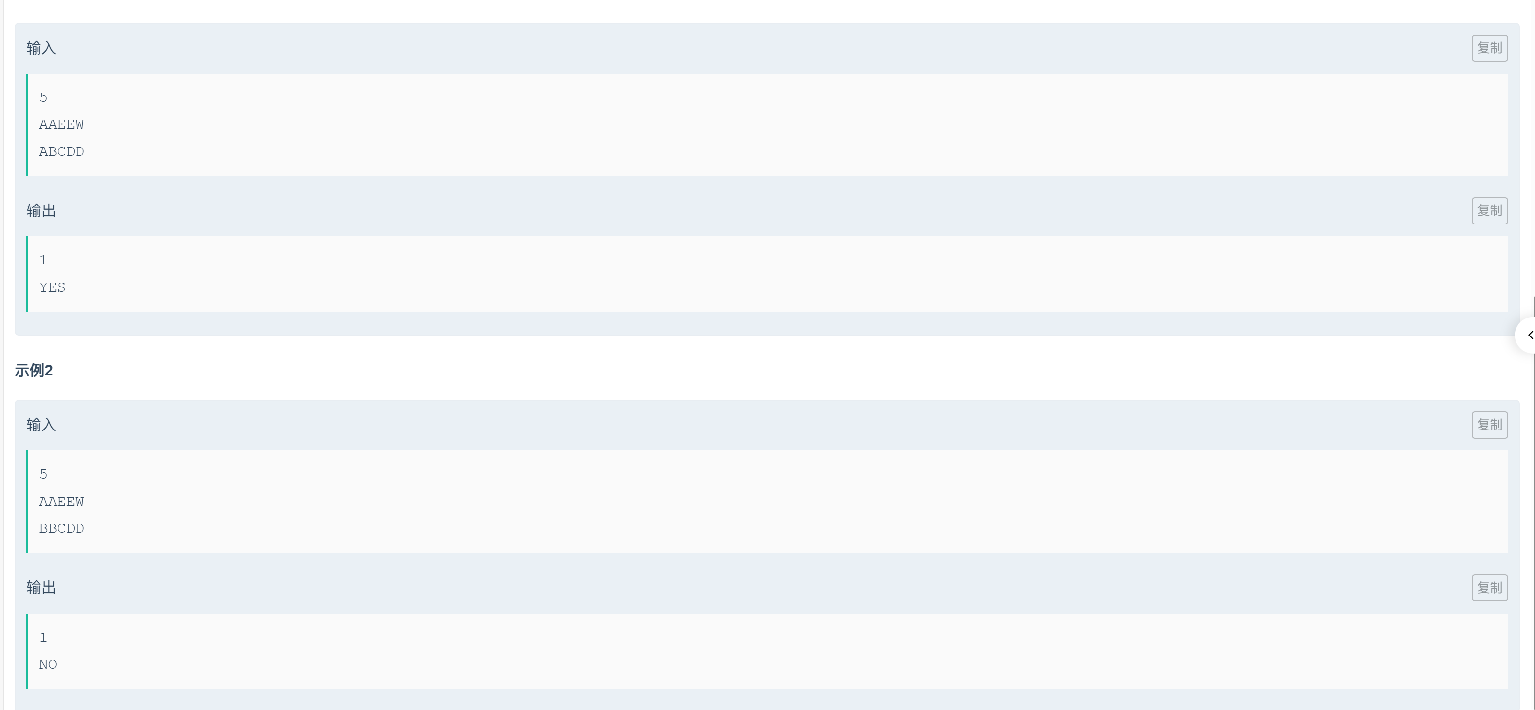 scanf("%s %s", a, b); // 读取Alice和Bob的牌(如 "AABBB" "ABCDE")