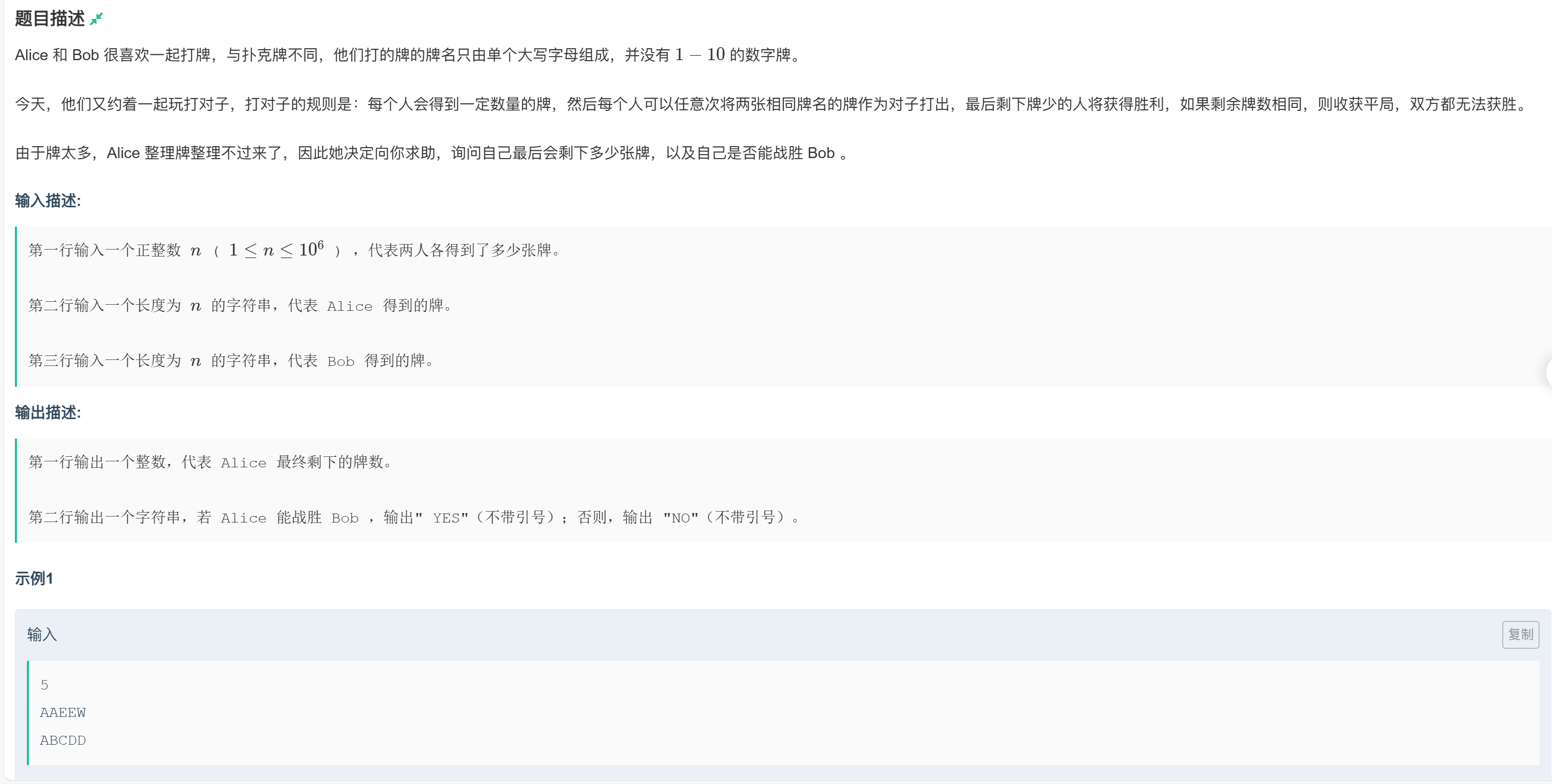 由于牌太多,Alice 整理牌整理不过来了,因此她决定向你求助,询问自己最后会剩下多少张牌,以及自己是否能战胜 Bob 。