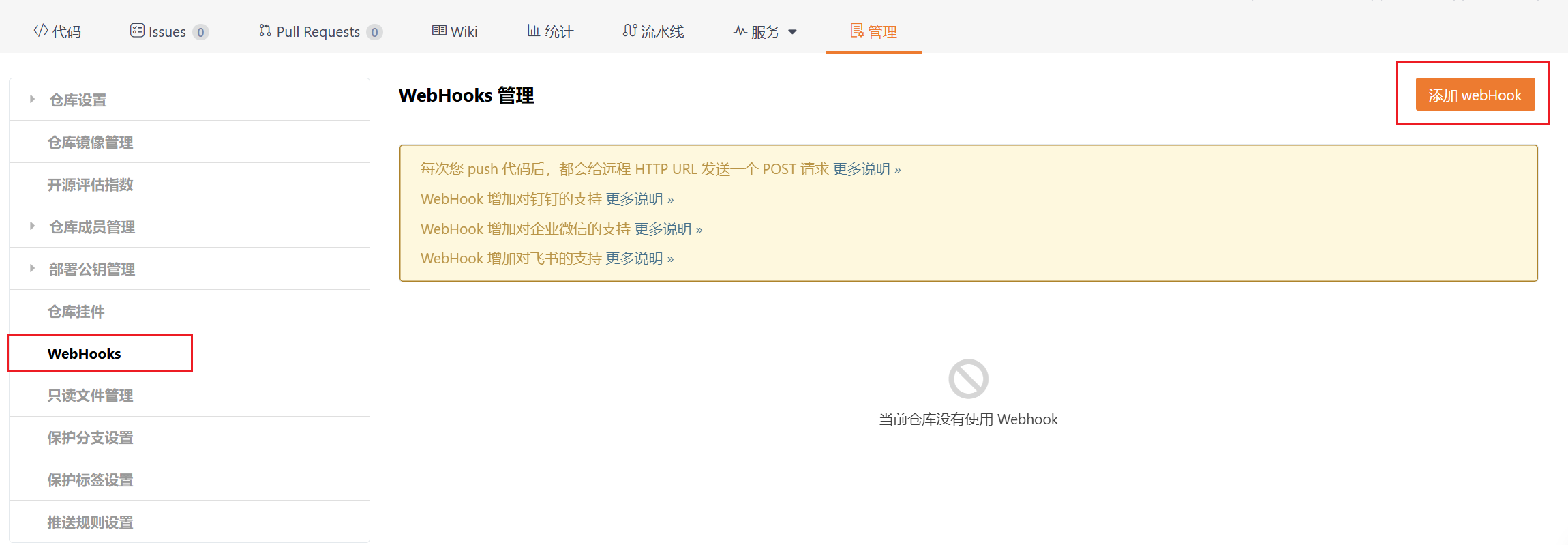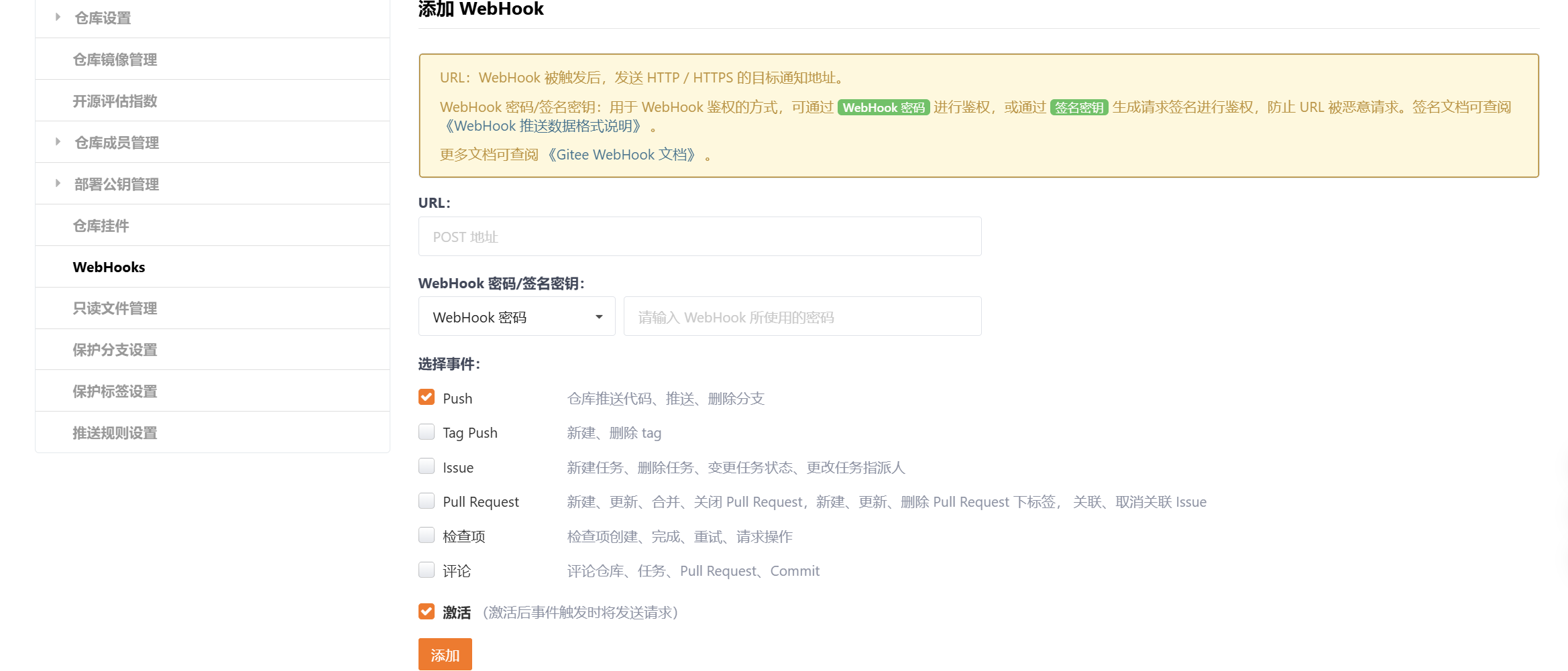 使用上面的方法刷新并不是真正实现的自动刷新,还要手动调用。如果我们想要实现完全的自动刷新,可以使用WebHook。Gitee 就提供了一种WebHook的方式,当有代码变更的时候,会调用我们设置的地址,来实现我们想达到的目的。