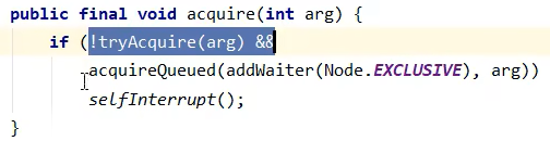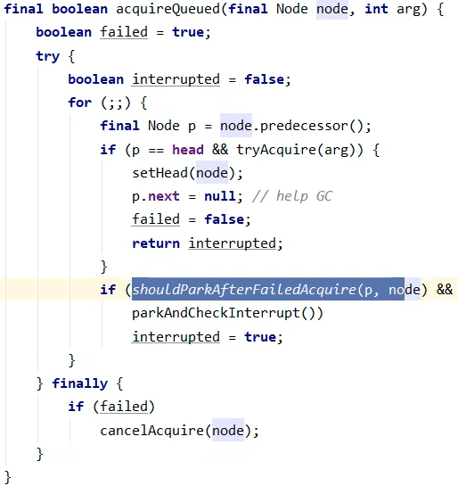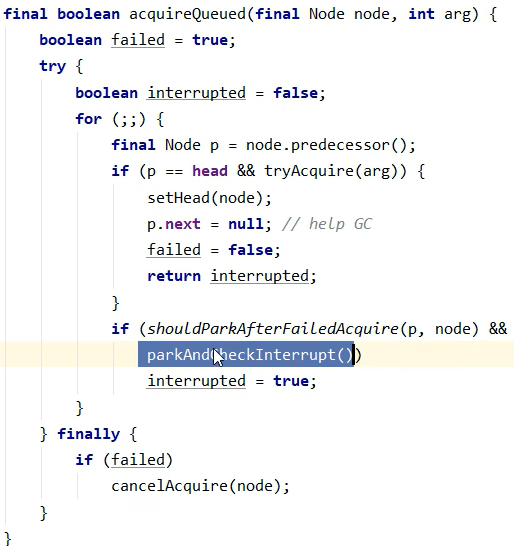 - acquireQueued会在第一个死循环中不断尝试获得锁,失败后进入park阻塞