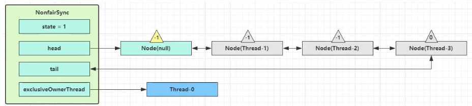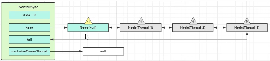 - 接下来进入addWaiter逻辑,构造Node队列 - 下图中黄色三角表示该Node的waitStatus状态,其中0为默认正常状态