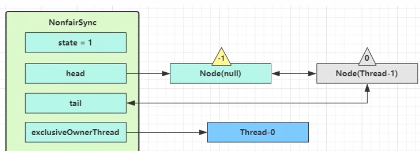 - Thread-1的Node在下一次循环时发现tryAcquire成功,设置exclusiveOwnerThread为Thread-1,state为1,head指向Thread-1所在的Node。