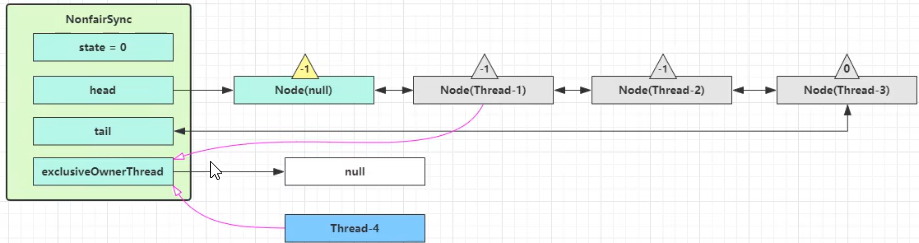 - 如果有其他线程(如Thread-4)竞争。 - Thread-4可能抢先设置为exclusiveOwnerThread,state为1。