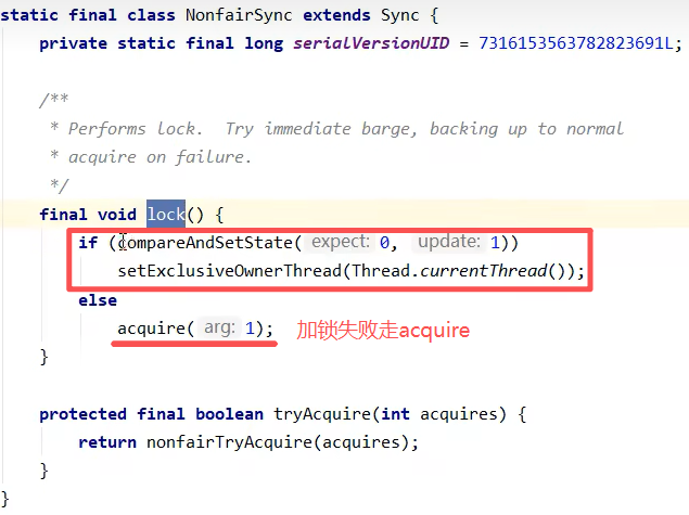 - 进入tryAcquire逻辑,这是state已经是1,结果仍然失败