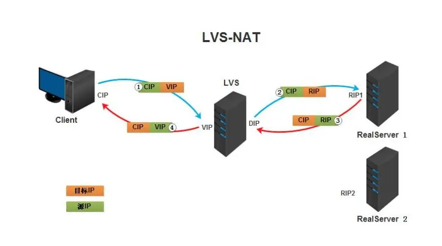 -  Real Server对比发现目标IP是自己,就会接受这个请求报文,开始构建响应报文发回给调度器。源IP为RIP,目标IP为CIP