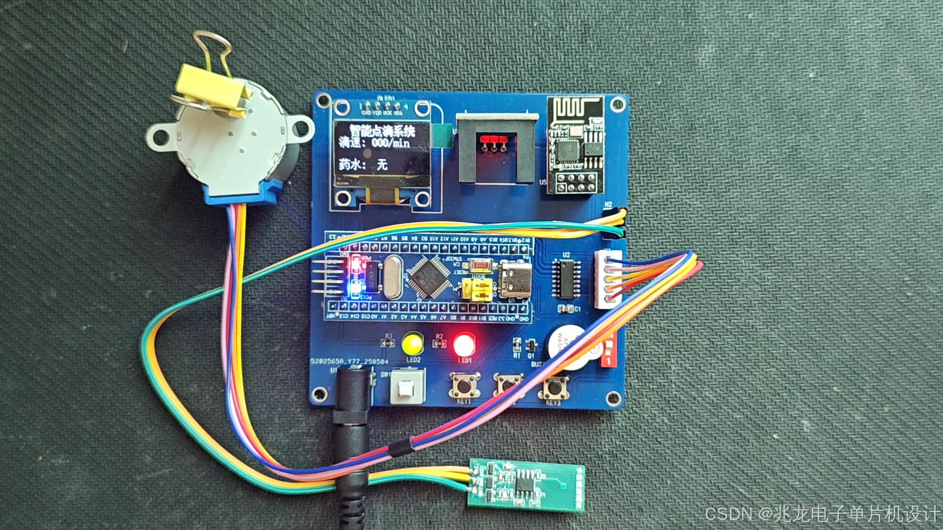 (1)点滴流速监测:光耦测速传感器实时检测点滴流速,当流速超过上限或低于下限报警,同时步进电机调整流速