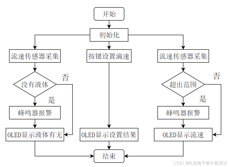 (4)报警系统:当流速超过上限或低于下限蜂鸣器报警