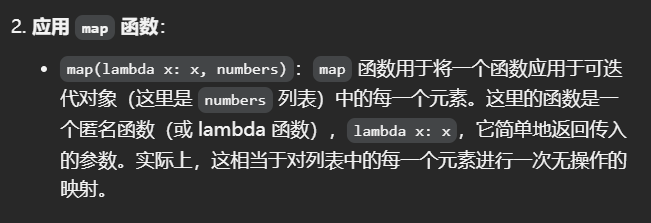 map(function, iterable)map函数,就是把iterable序列里面的每个元素都用到前面的function函数中,然后将function函数的运行结果逐一返回,感觉用于值转换,列表里的是自变量,然后function是函数,map返回自变量带入函数之后的因变量。