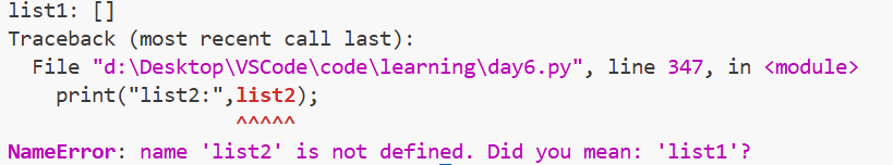 这说明上面那种删除方式,是清空列表内元素,但列表本身还在,所以打印的是空列表,而下面那种,则是直接把列表本身就删除了,所以打印错误会。