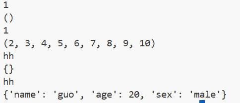 function1("hh",name="guo",age=20,sex="male")#这里传送了c和d两个参数,d是一个字典,里面存放了name,age,sex三个参数。运行结果:
