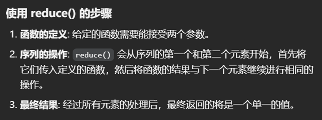 reduce(function, iterable)通过对序列中的元素重复应用某个函数,将序列元素累积成单一的值。
