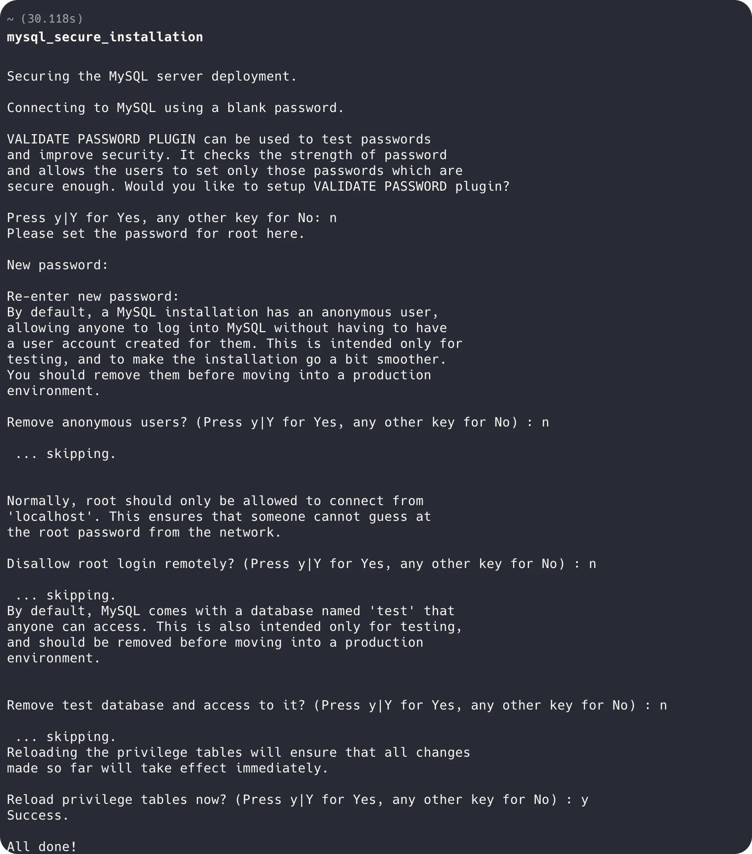 environment.Remove test database and access to it? (Press y|Y for Yes, any other key for No) : 这里问你要不要删除 test数据库,这是一个测试数据库,任何人都有权限访问它,一般无脑回车就可以了,不需要弄的那么麻烦,如果你需要输入Y