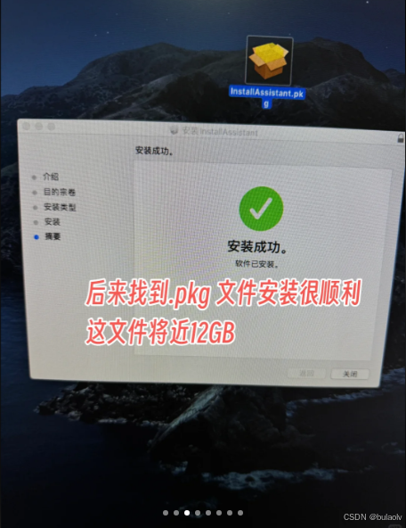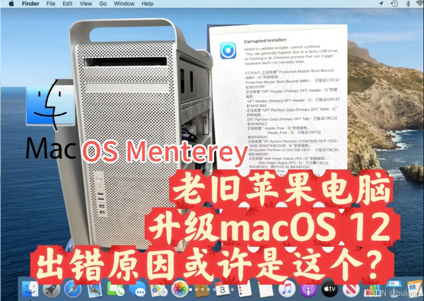 我的电脑是macpro 2012年中,尝试了好多次会出现各种不同报错,下边右图报错信息是安装时报错的提示,更换u盘或是更换usb 插口没有作用,但最后还是解决了,原因应该是安装包的问题。