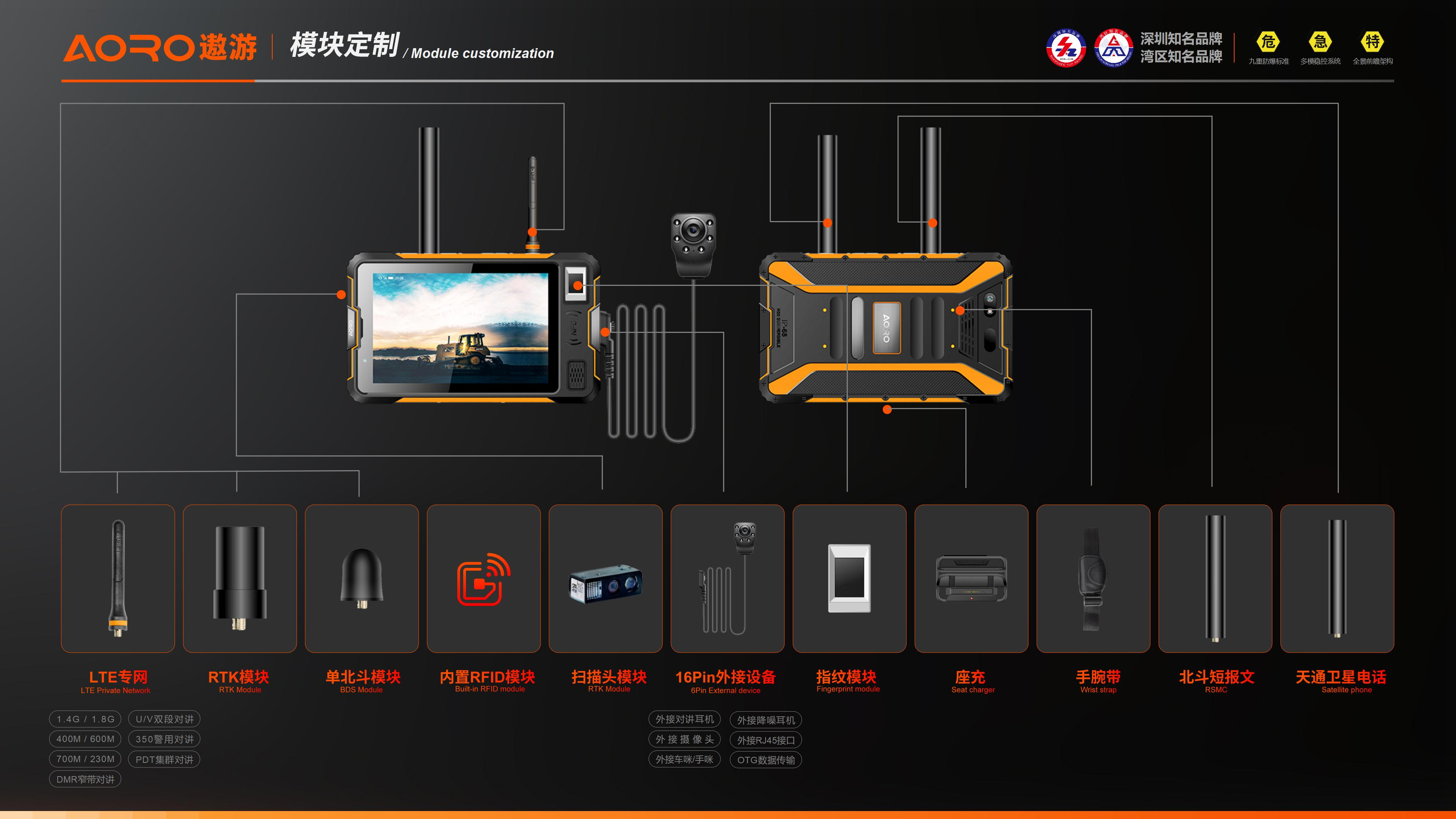 为满足不同行业的专业化需求,AORO P9000U三防平板提供了丰富的定制化模块。用户可根据实际应用选配工业大指纹识别、天通卫星电话、RTK北斗高精度定位等功能。其中RFID模块与1D/2D扫描头显著提升仓储管理的效率,而北斗短报文与PDT集群对讲则为应急救援提供通信保障。这种模块化设计理念使设备能快速适配能源、交通、公安等垂直领域的需求,避免重复投入,降低数字化转型成本。