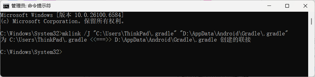 mklink /J "C:\Users\ThinkPad\.gradle" "D:\Android\Gradle\.gradle"参数解释: