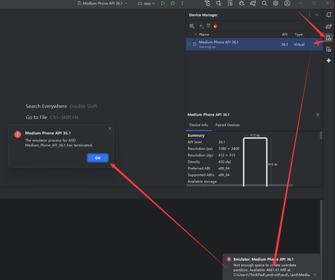 - 你应该能看到之前创建的所有模拟器都还在。如果有错误提示,可以新建一个模拟器。