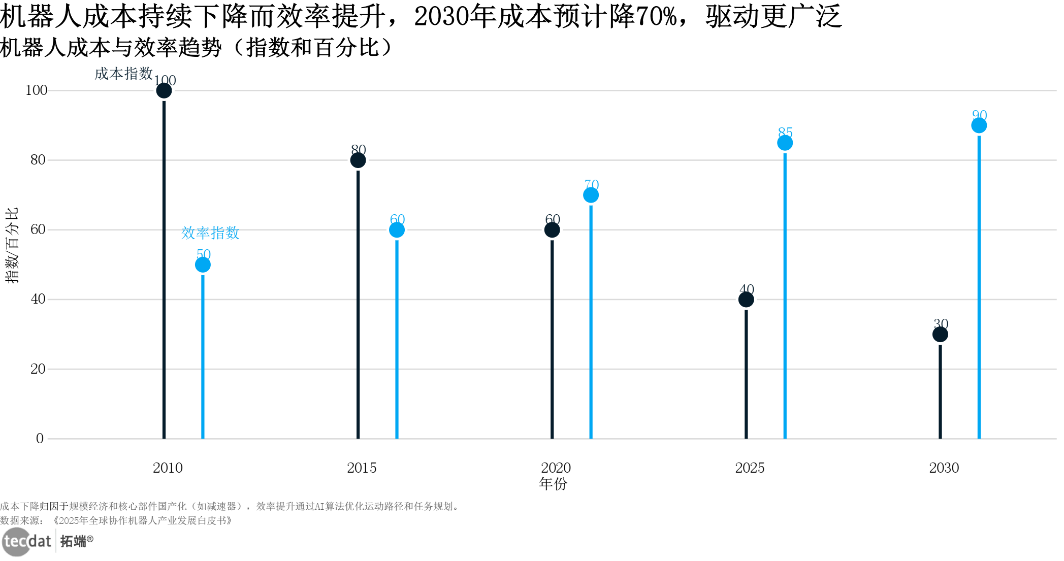 买机器人划不划算,核心看“成本”与“效率”的平衡。过去10年,机器人成本持续下降,效率却不断提升,2030年将迎来关键拐点——成本仅为2010年的30%,效率接近90%,这会让更多中小企业愿意“下手”。