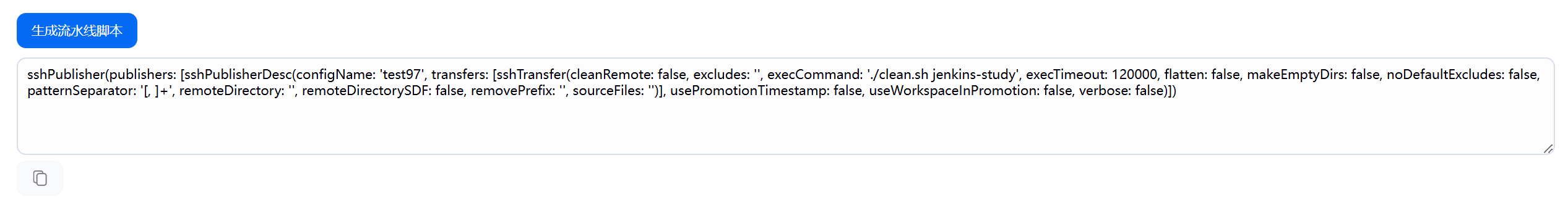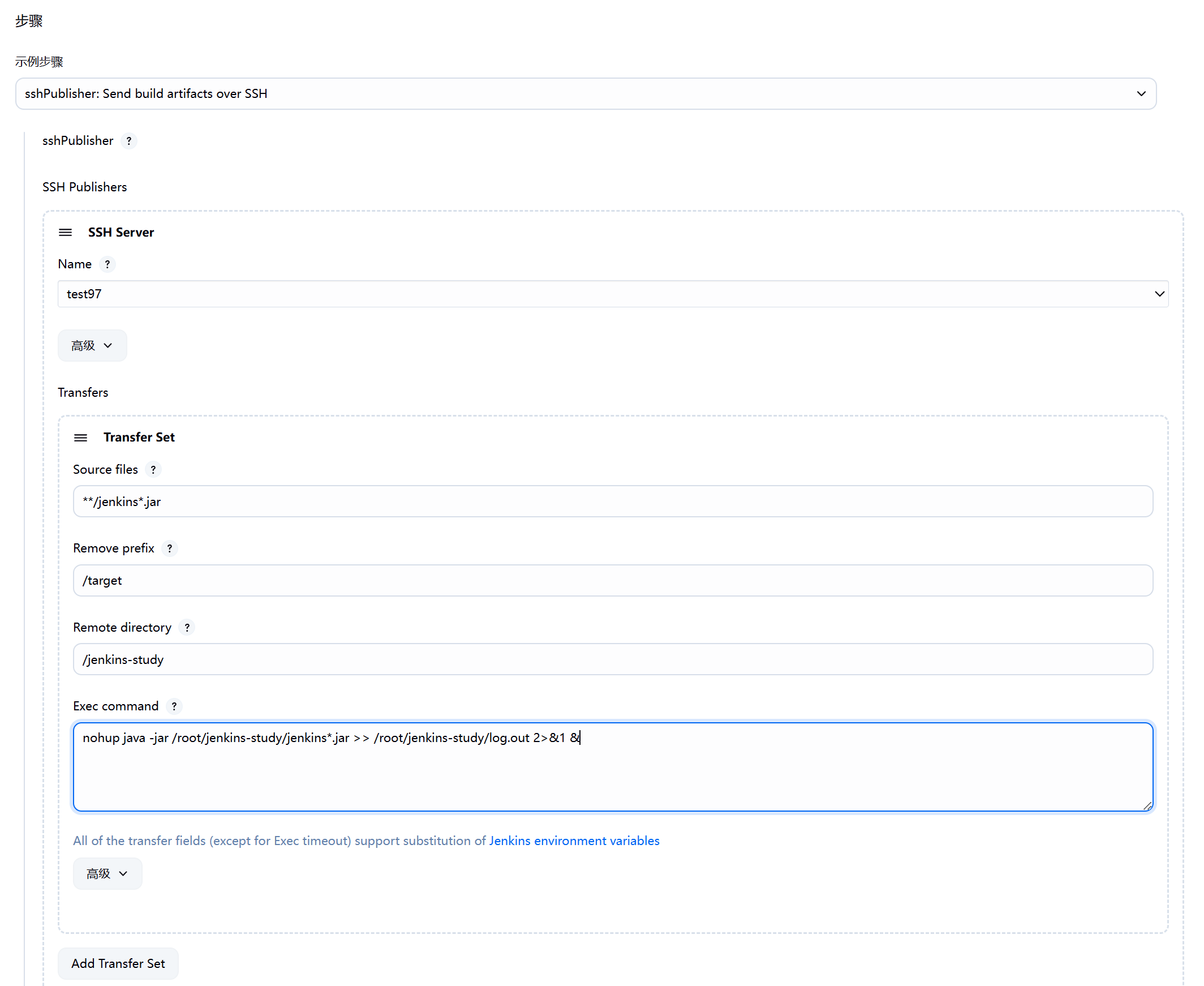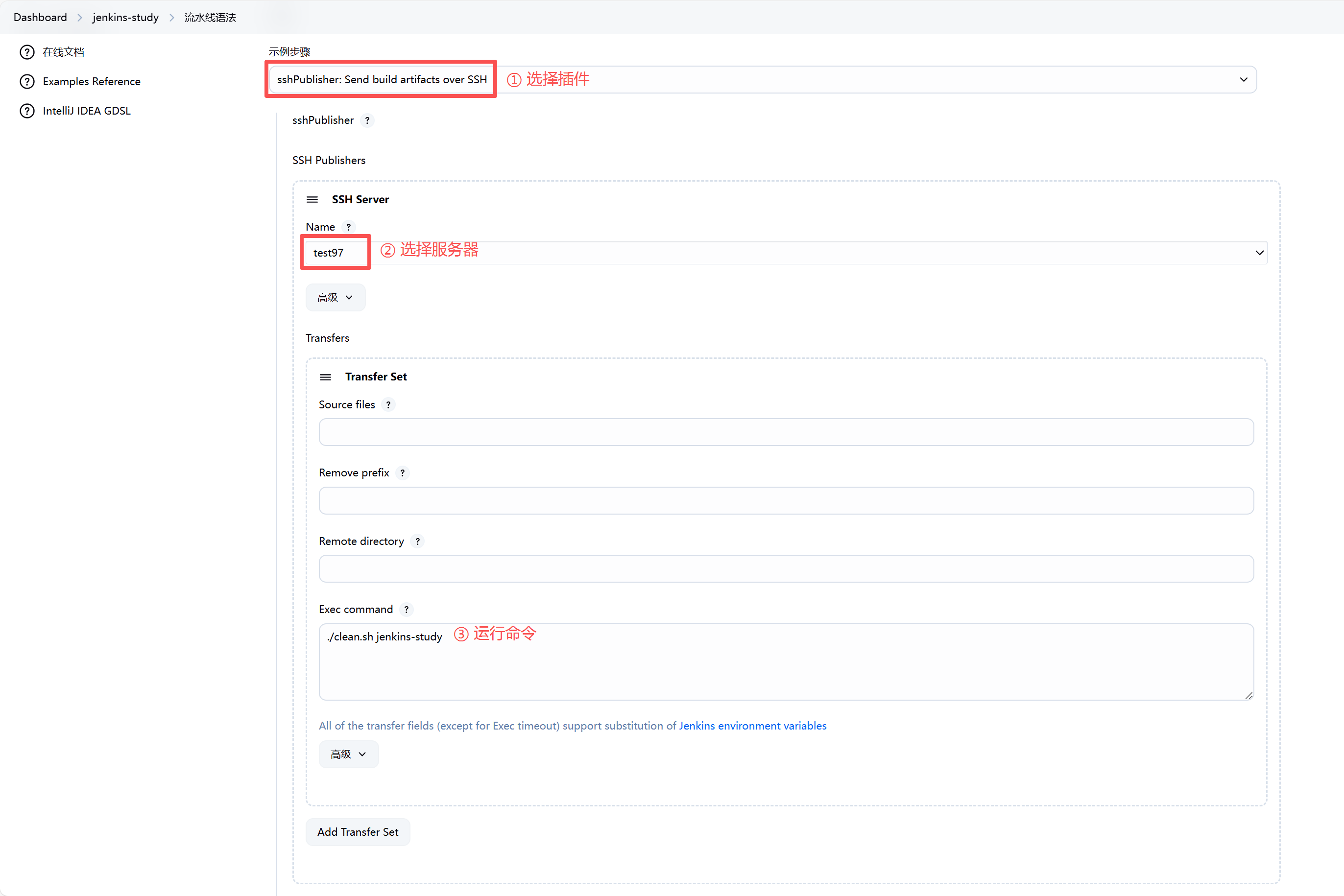 在 流水线语法 配置 SSH Publishers,可以参考 实战1 的配置。