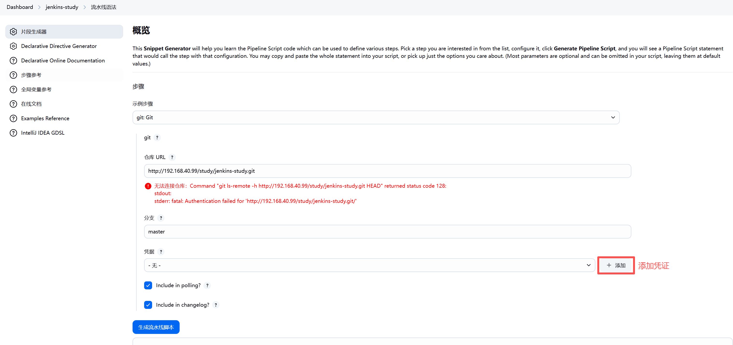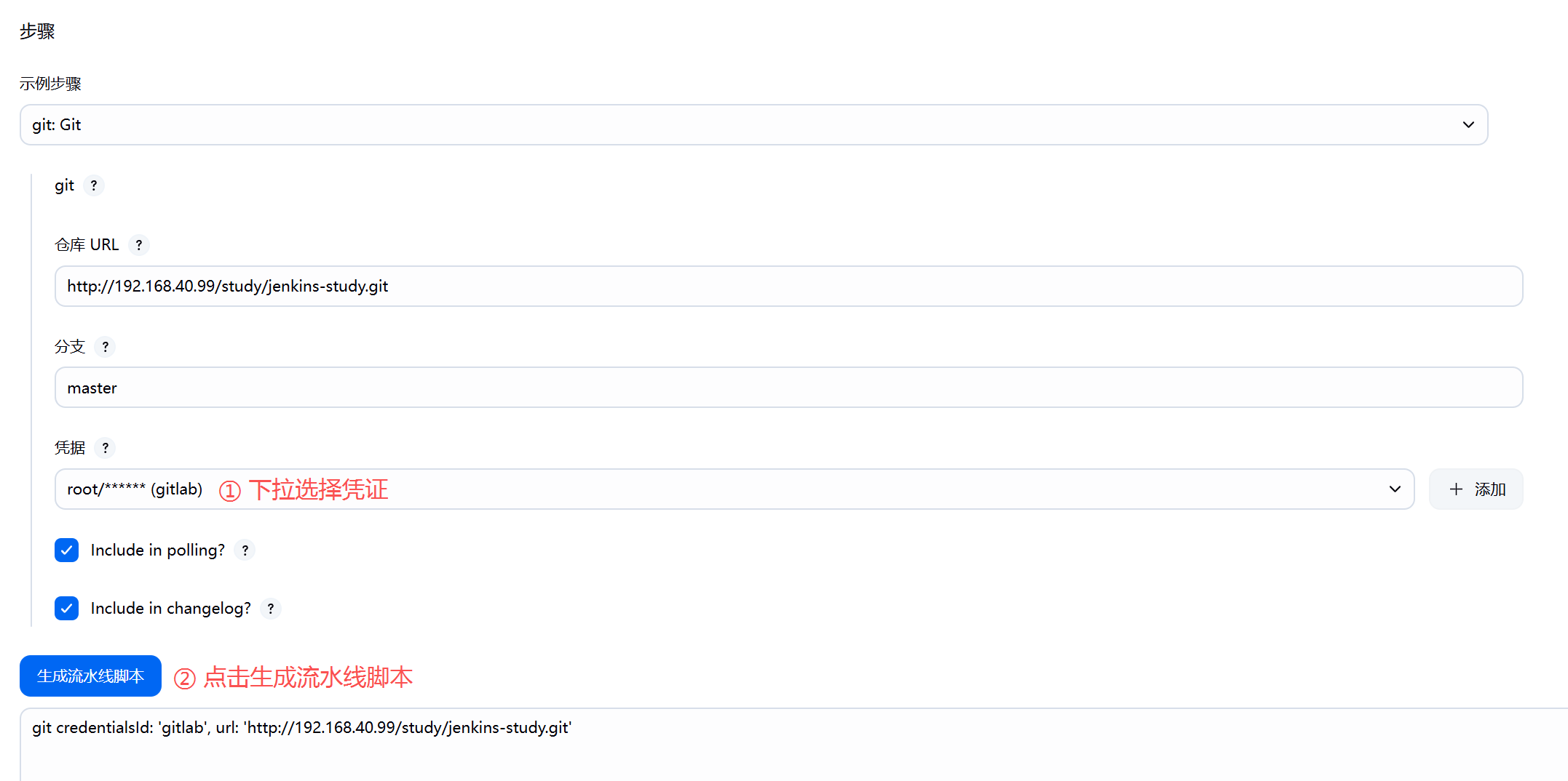 git credentialsId: 'gitlab', branch: 'main', url: 'http://192.168.40.99/study/jenkins-study.git'
