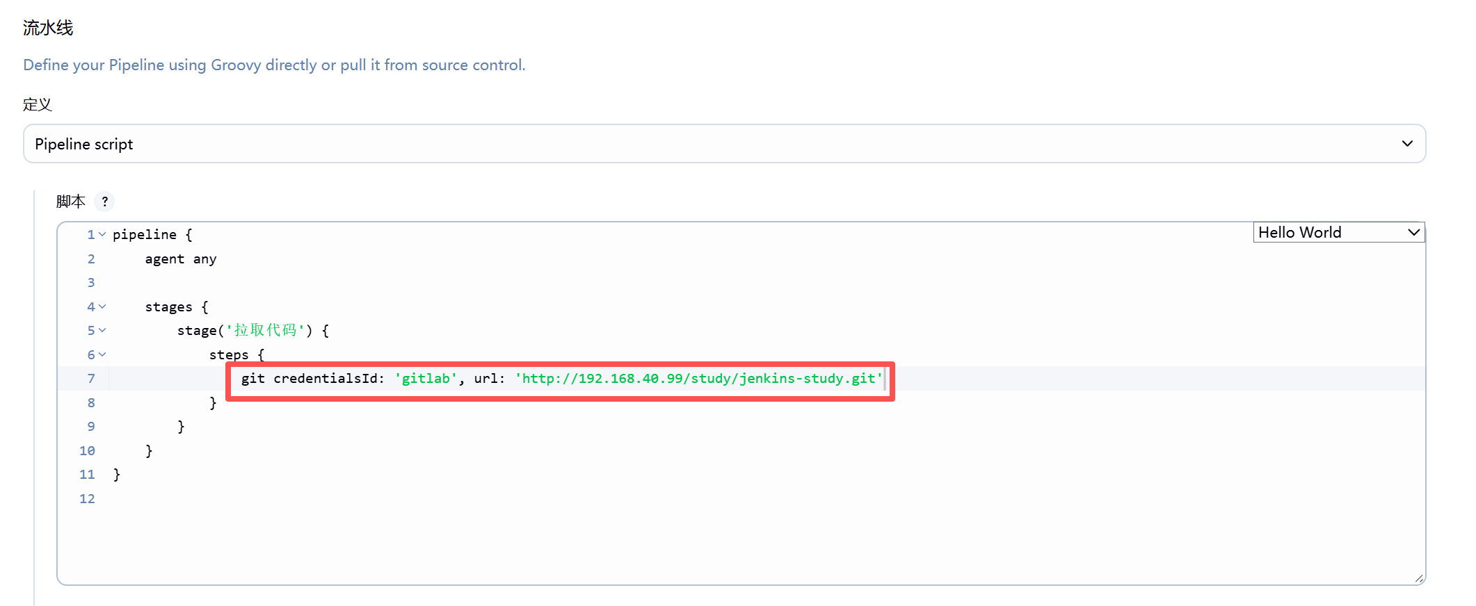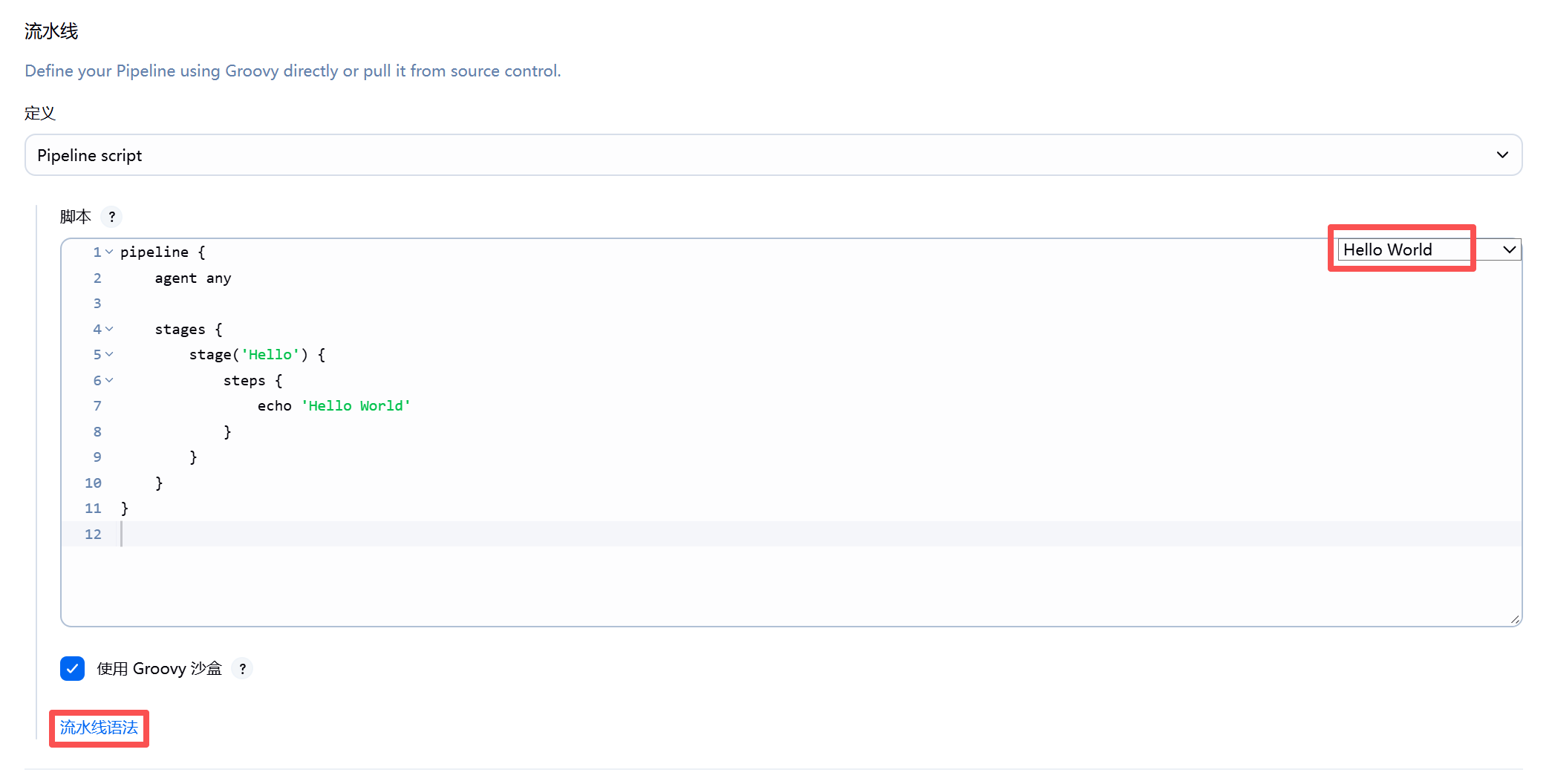 在右侧下拉选项中,选择 Hello World,以此为基础,编写流水线脚本。