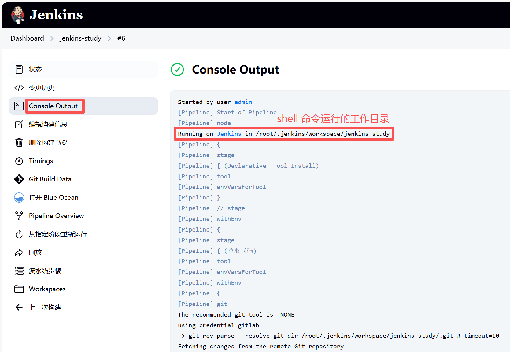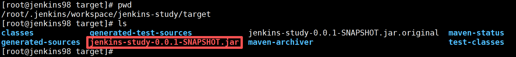 构建成功后,默认会在 /root/.jenkins/workspace/jenkins-study/target 目录下,帮我们生成一个 jar 包,说明构建 jar 包成功。
