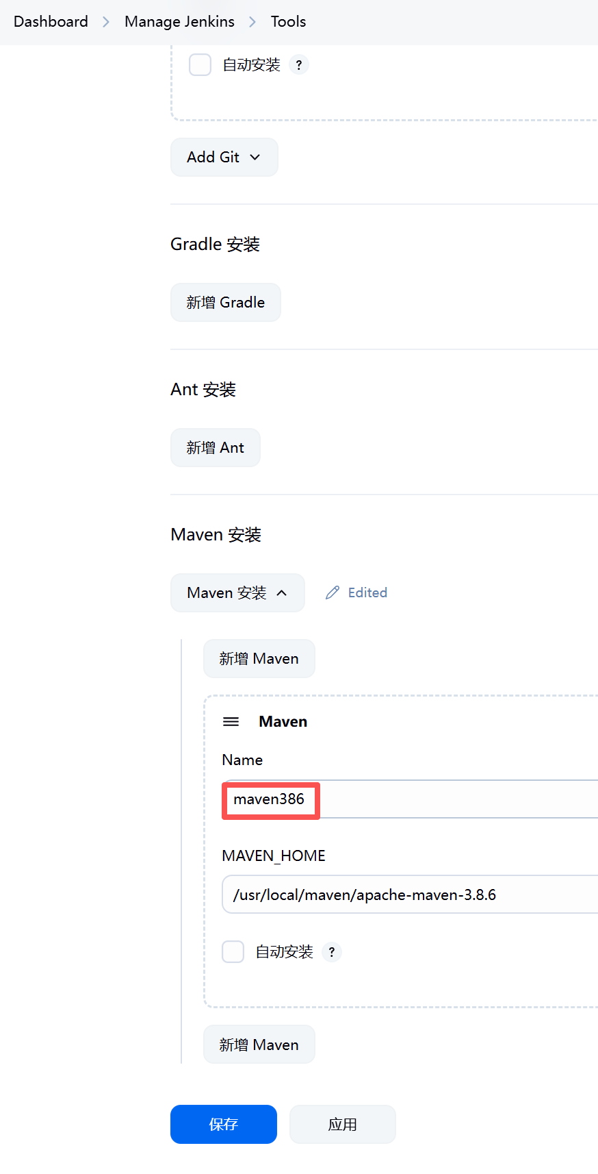 Maven 我们在 实战1 已经配置过了,所以流水线中我们可以直接拿它的名字 maven386 来使用。